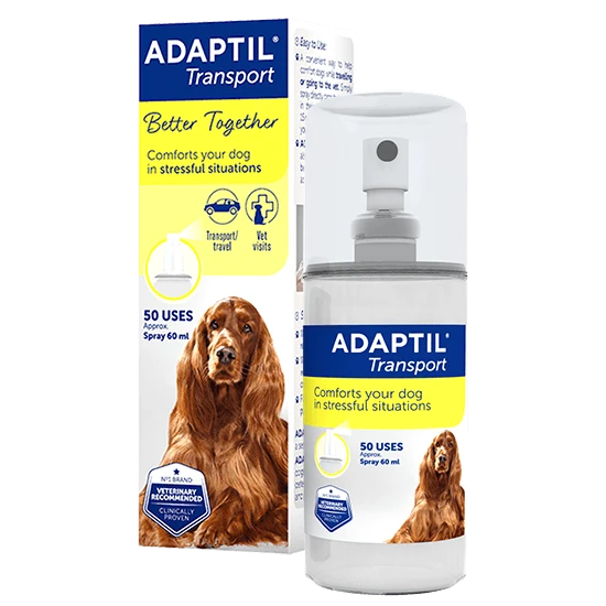 Adaptil Transport Spray is a temporary calming aid for dogs, and can be used on the go, including in the car, in kennels or crates, and can be sprayed onto your dogs bedding to ease stressful situations.