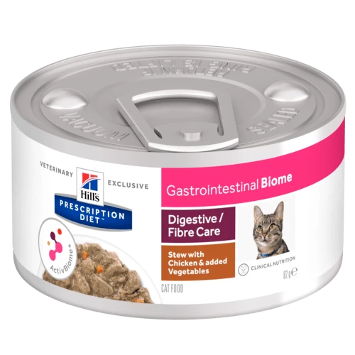 Hills Gastrointestinal Biome Wet Stew Cat Food is a complete dietetic pet food that provides all the nutrition your adult cat needs, with bite-sized chunks of chicken and added vegetables.