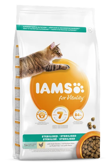 Iams for Vitality Light in fat / Sterilised cat food for adult and senior cats with fresh chicken is a 100% complete and balanced diet that helps to support your cat’s 7 signs of healthy vitality, whilst managing your feline’s weight. All of this packed into a tasty recipe with 84% animal protein (out of total protein) for your pet to enjoy every day.