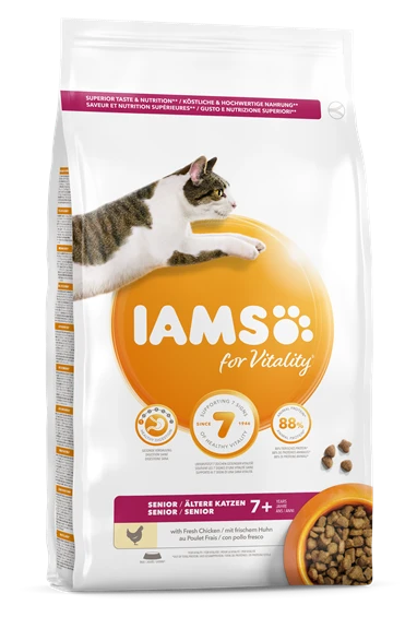 Iams for Vitality for senior cats with fresh chicken is a 100% complete and balanced diet designed to help support your cat’s 7 signs of healthy vitality, so you can admire their shiny coat and healthy skin. All of this packed into a tasty recipe with 88% animal protein (out of total protein) for your pet to enjoy every day.
