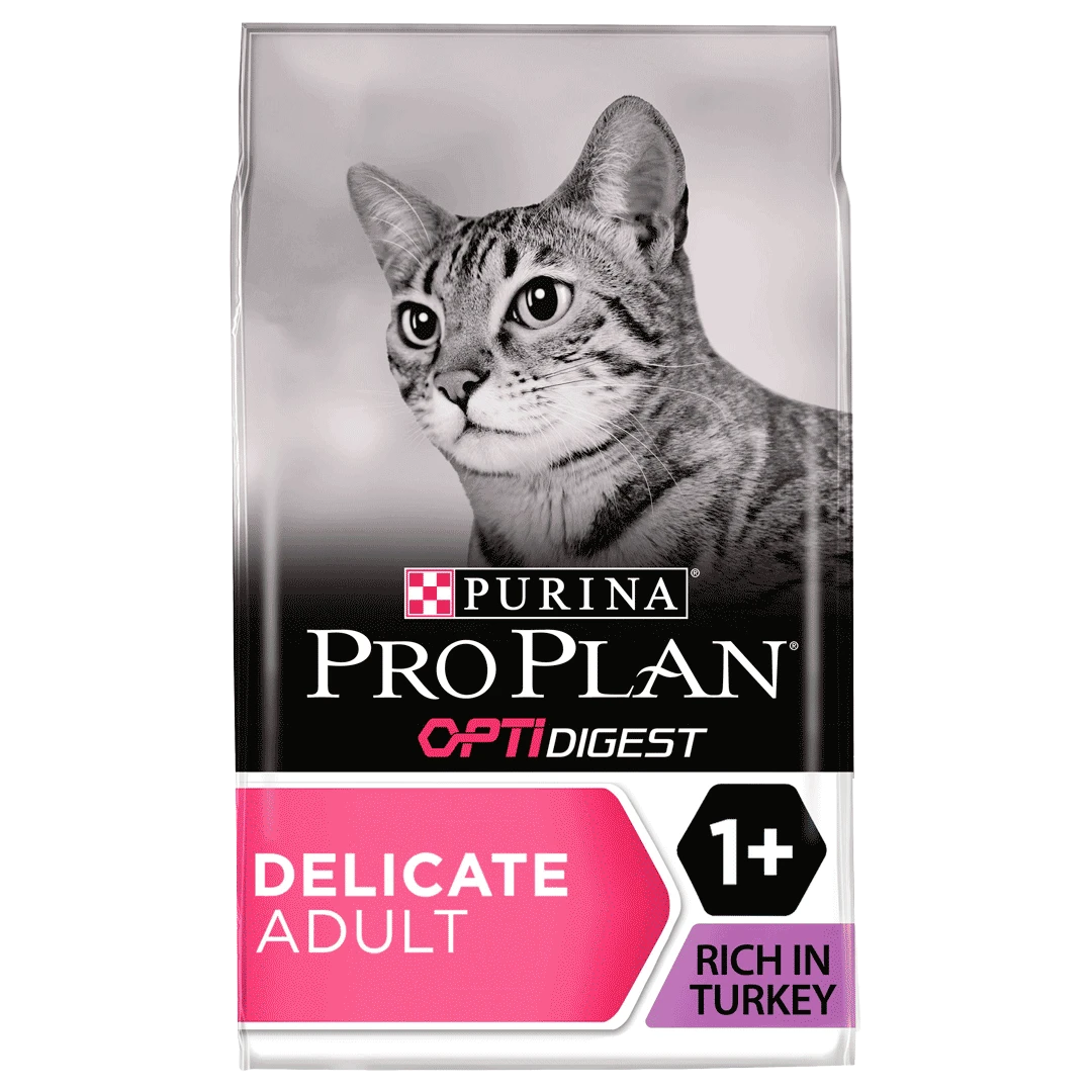 Purina Pro Plan Cat Optidigest Delicate Adult Dry Food with Turkey is for cats with delicate digestion or delicate skin. It contains selected protein sources and natural prebiotics, proven to help promote a healthy digestive system and helps reduce skin discomfort associated with food sensitivity.