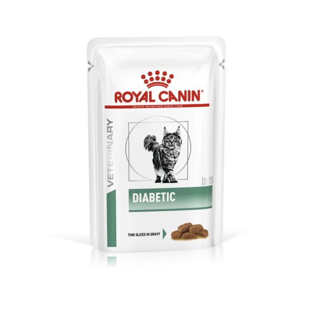 Royal Canin Diabetic Feline Wet Pouches with thin slices in gravy are for cats with diabetes mellitus.